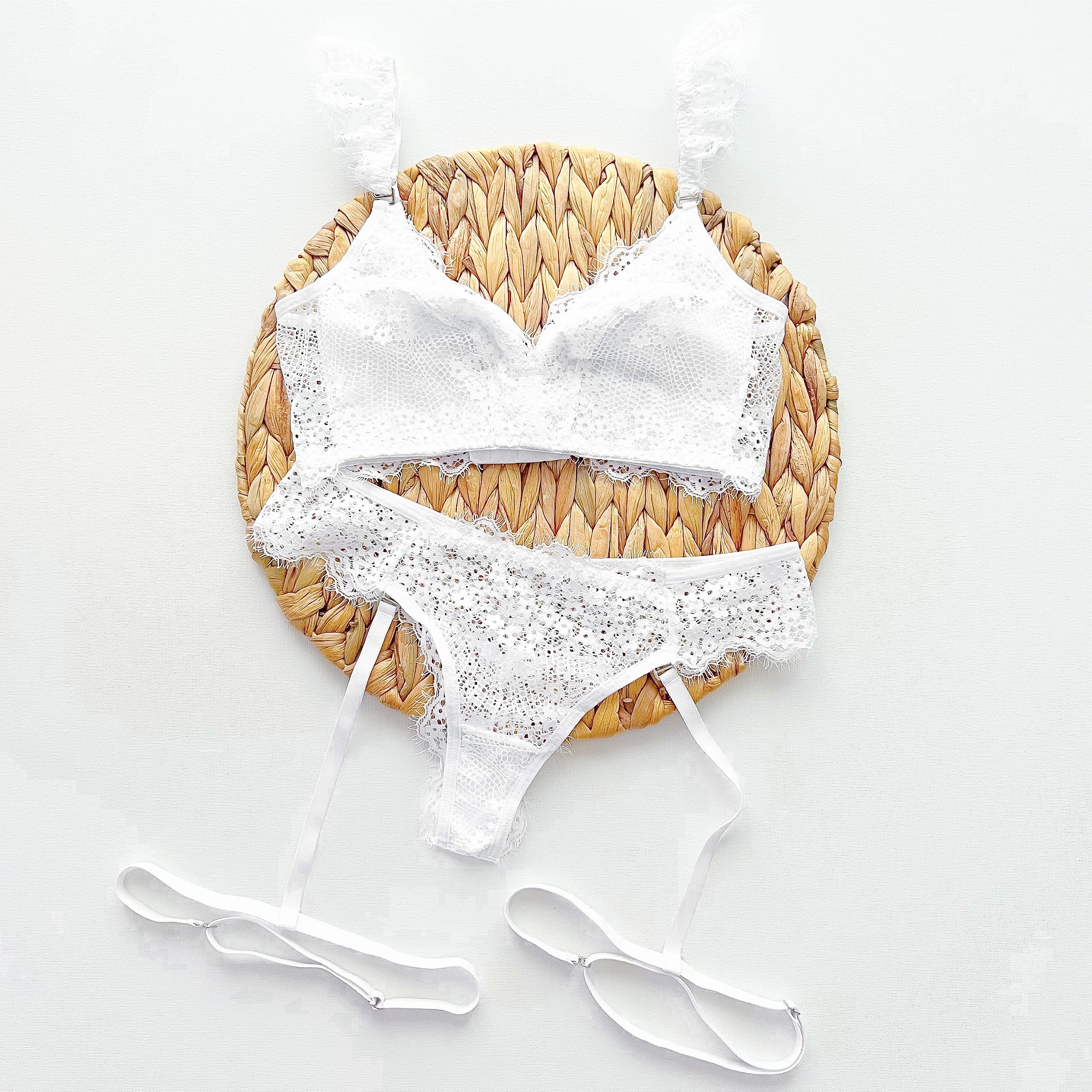 O conjunto Afrodite é simplesmente DES-LUM-BRAN-TE! Ele é composto por sutiã sem bojo, todo rendado, com forro no busto e abotoamento nas costas. Possui duas opções de alças que podem ser trocadas de acordo com a sua vontade: uma delas possui um detalhe em renda super charmoso e a outra é a clássica de elástico; ambas são reguláveis em tamanho. A calcinha também é toda trabalhada em renda. Ela é modelo semi fio atrás e possui as laterais mais larguinhas, e o forro é 100% algodão. A calcinha ainda é acompanhada por uma liga de perna de tamanho ajustável que traz um toque de sensualidade a peça, podendo ser removida quando você quiser. Apaixonante!