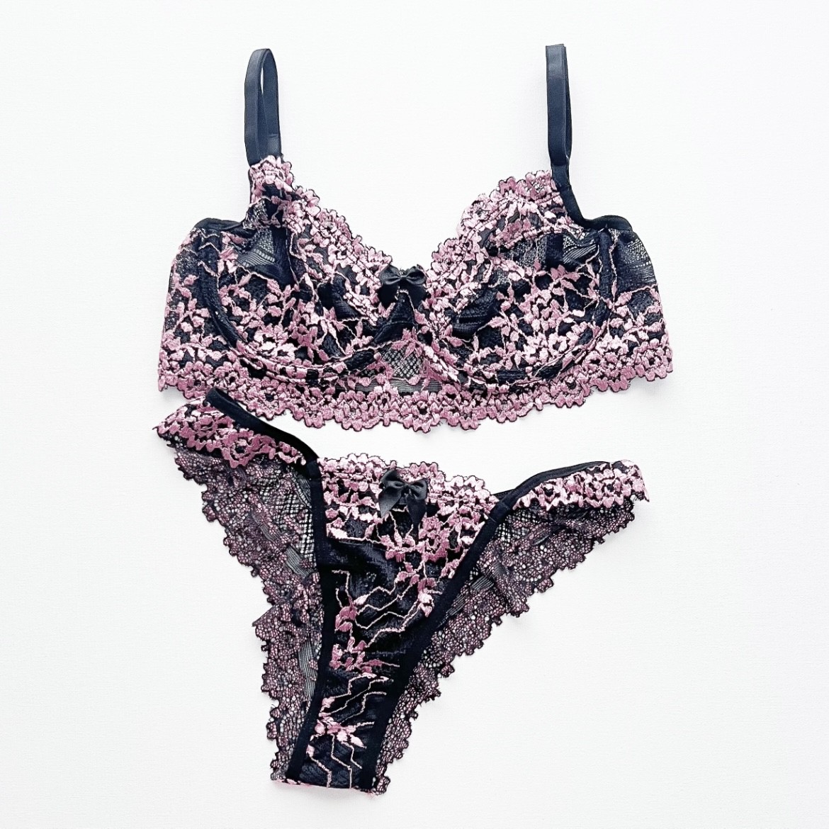 O conjunto Maria flor é um clássico aqui na Mood! Ele é composto por calcinha rendada semi fio (forro 100% algodão) e sutiã sem bojo e com aro, que garante uma modelagem impecável no busto (o Maria Flor preto com rosa chá não possui forro no busto). É o conjunto perfeito para as meninas que buscam conforto e elegância em uma peça só!