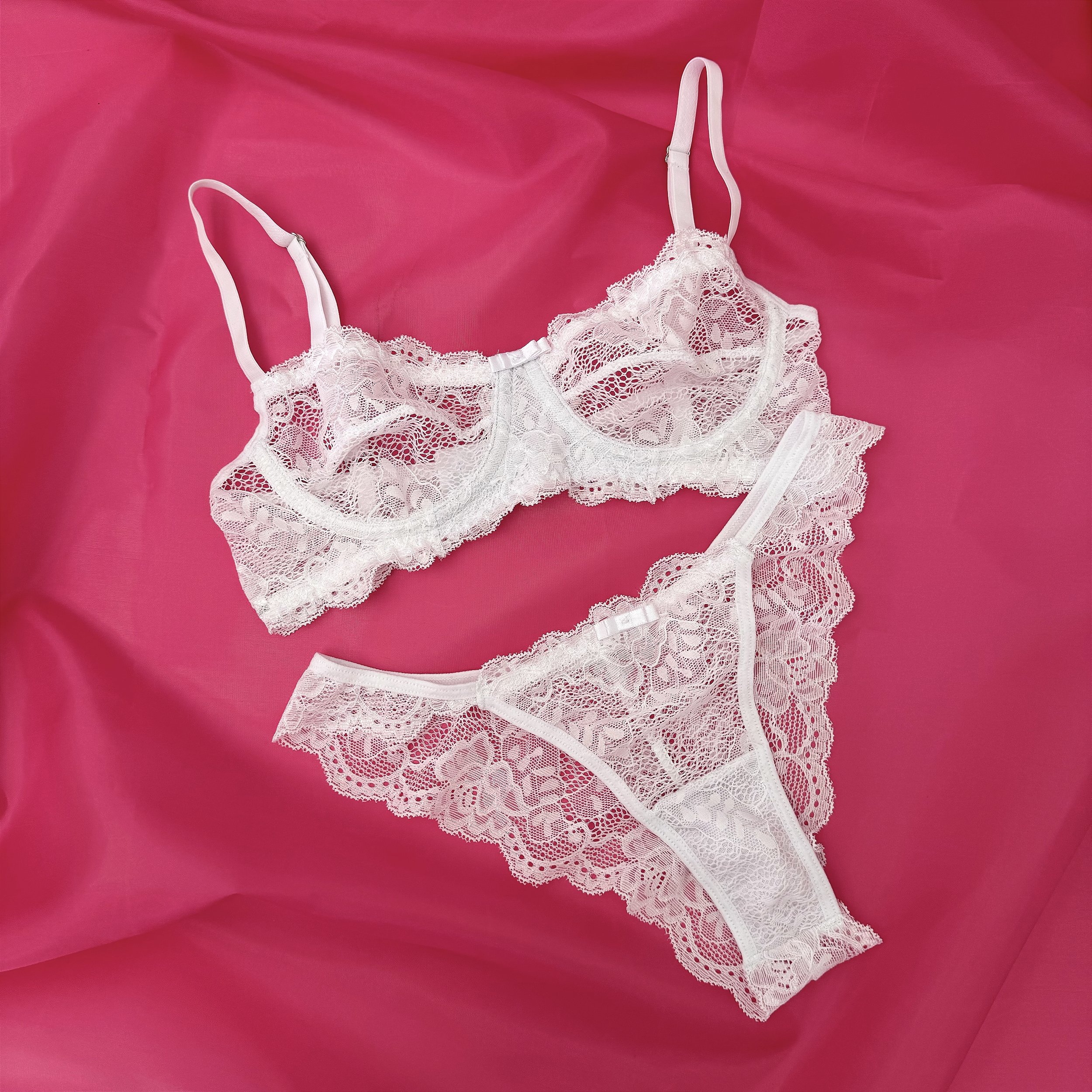 O conjunto Carolina liso é super delicado e romântico! Ele é composto por sutiã sem bojo, com aro e sem forro, além de possuir abotoamento nas costas. A calcinha é modelo semi fio, toda confeccionada em renda e com lateral mais larguinha (forro 100% algodão). Um charme!